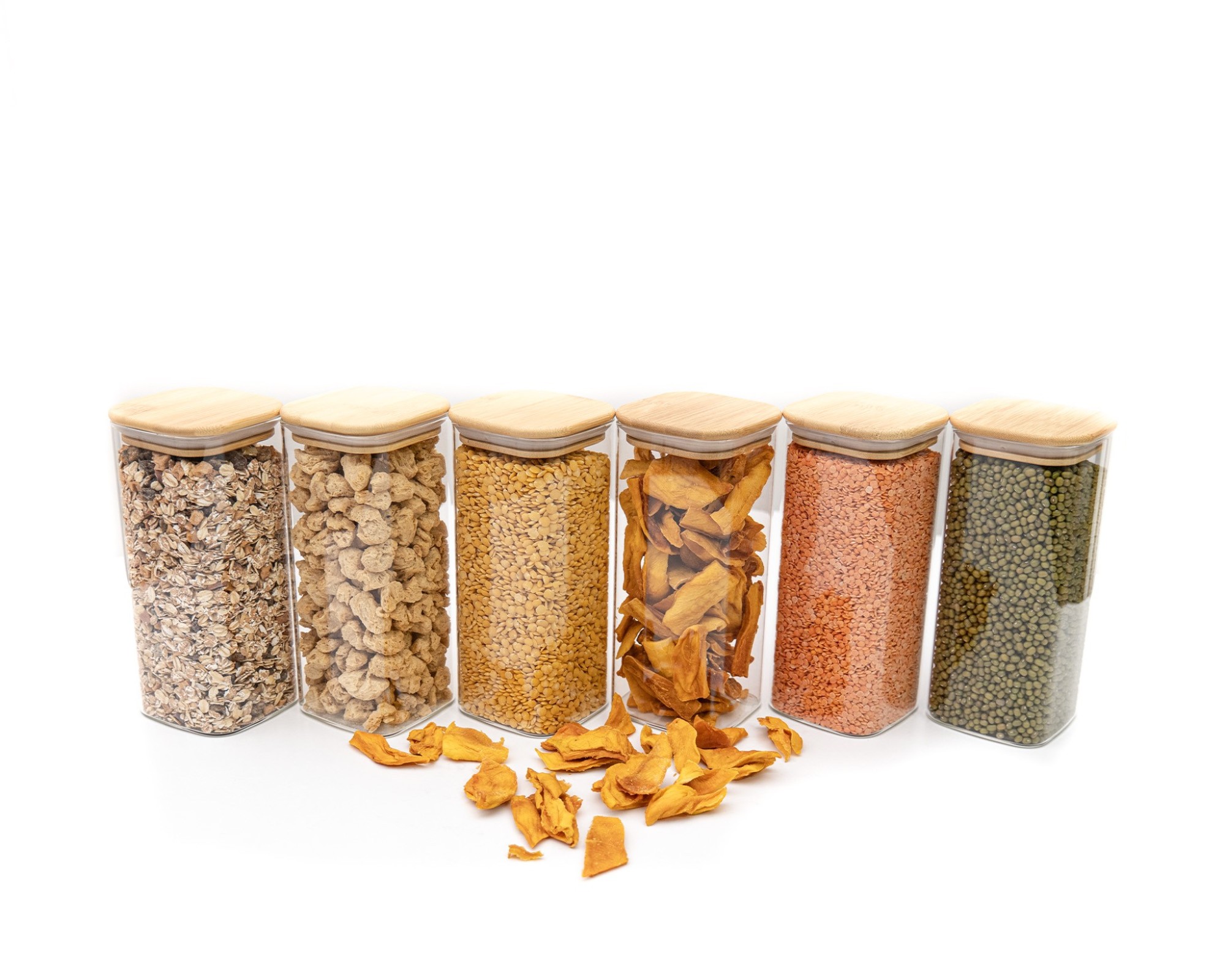 • Vorratsgläser aus Glas mit quadratischem Bambusdeckel