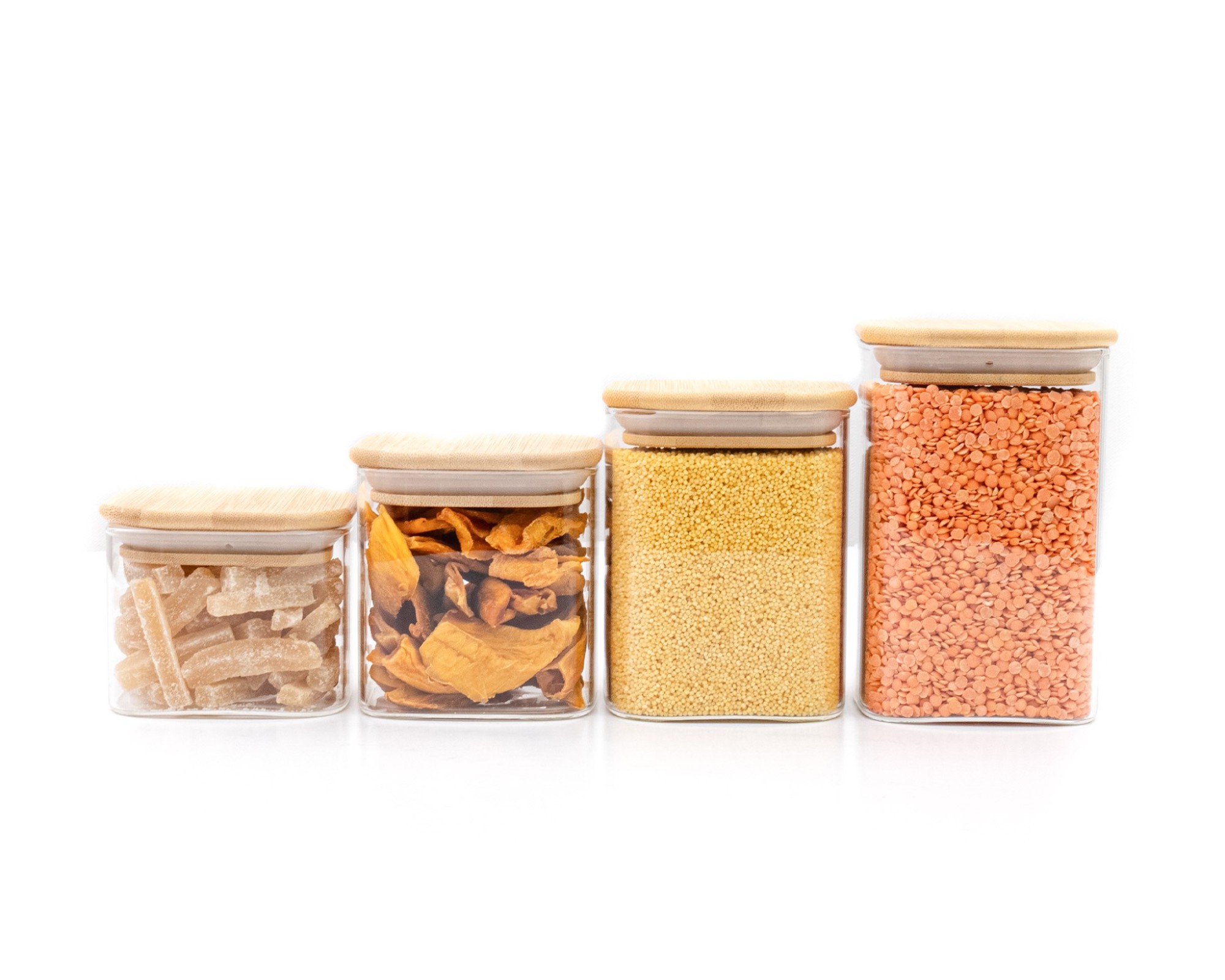 4 stabile Glasbehälter mit 4 unterschiedlichen Höhen (6cm, 8cm, 10cm und 12cm, mit Deckel jeweils 1cm höher)