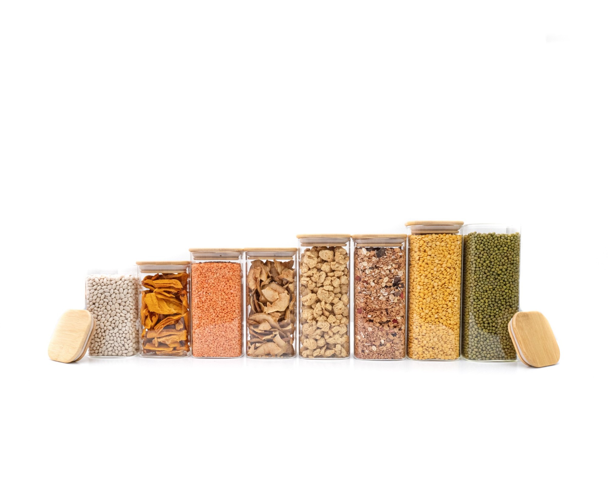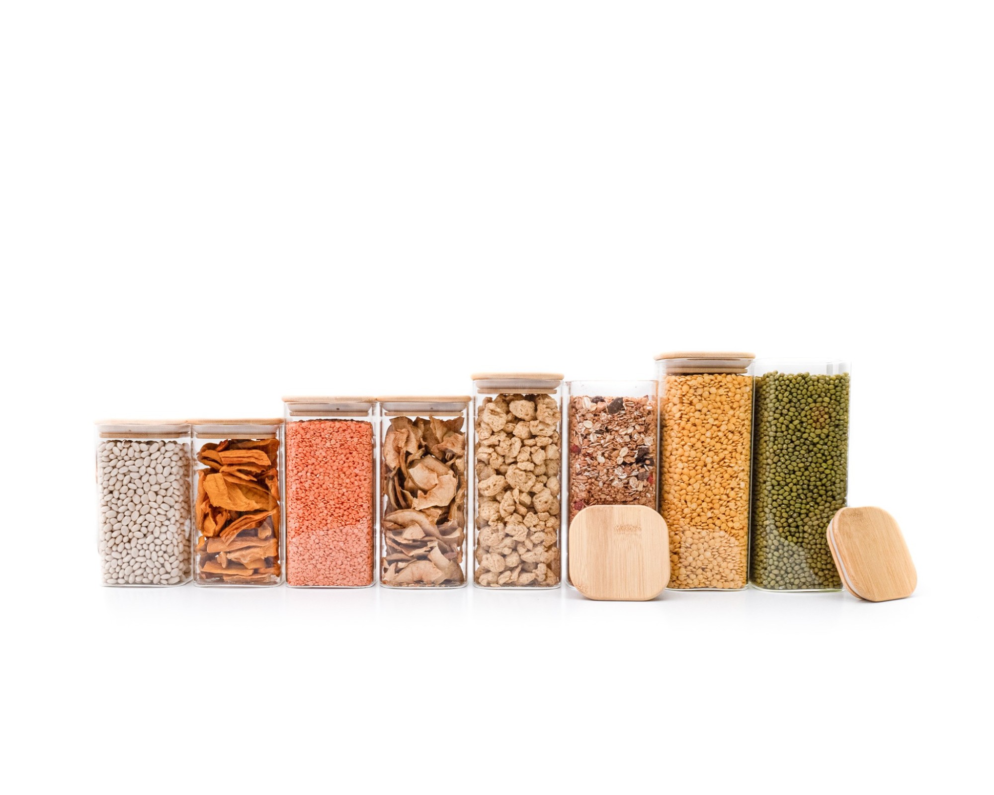 • Schmale quadratische Vorratsgläser aus Glas mit Bambusdeckel und 8cm Durchmesser