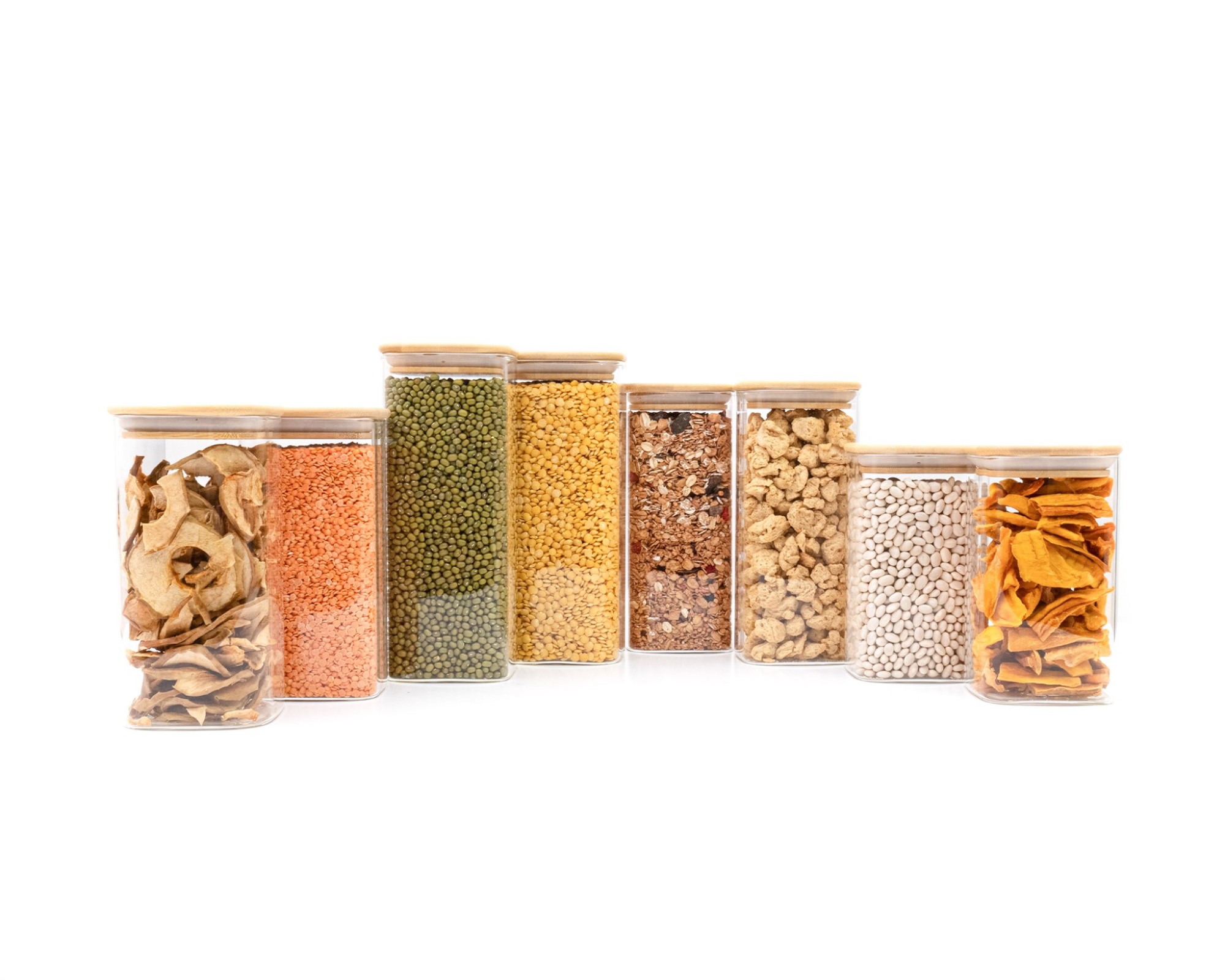 • 8 stabile Glasbehälter mit 4 unterschiedlichen Höhen (14cm, 16cm, 18cm und 20cm, mit Deckel jeweils 1cm höher)