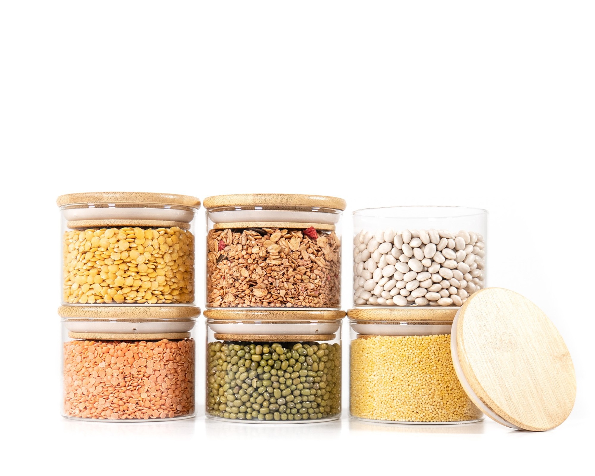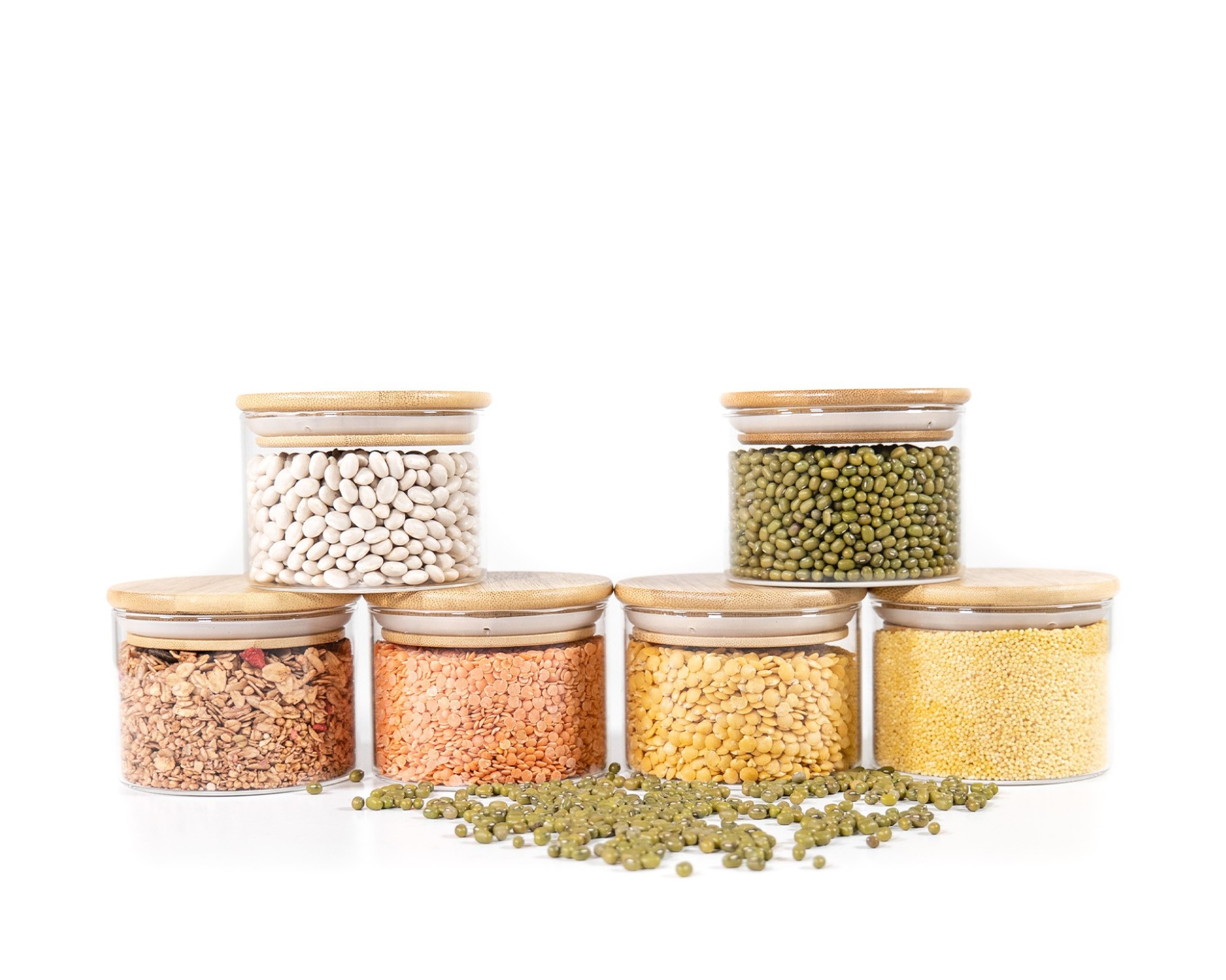 Récipients de rangement en verre élégants avec couvercles ronds en bambou