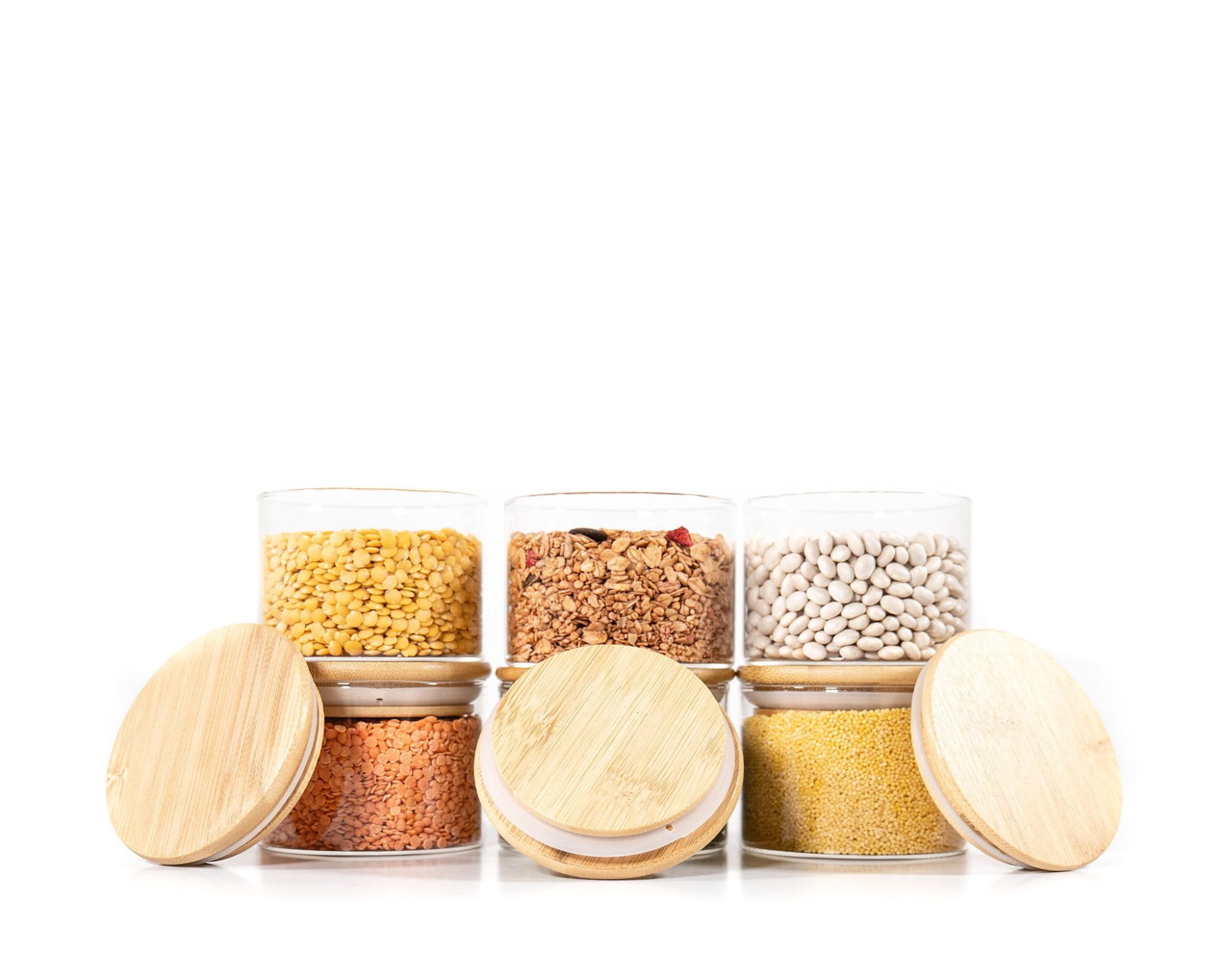 Le récipient en verre est en verre borosilicaté, le couvercle est en bois de bambou avec un anneau en silicone hermétique.