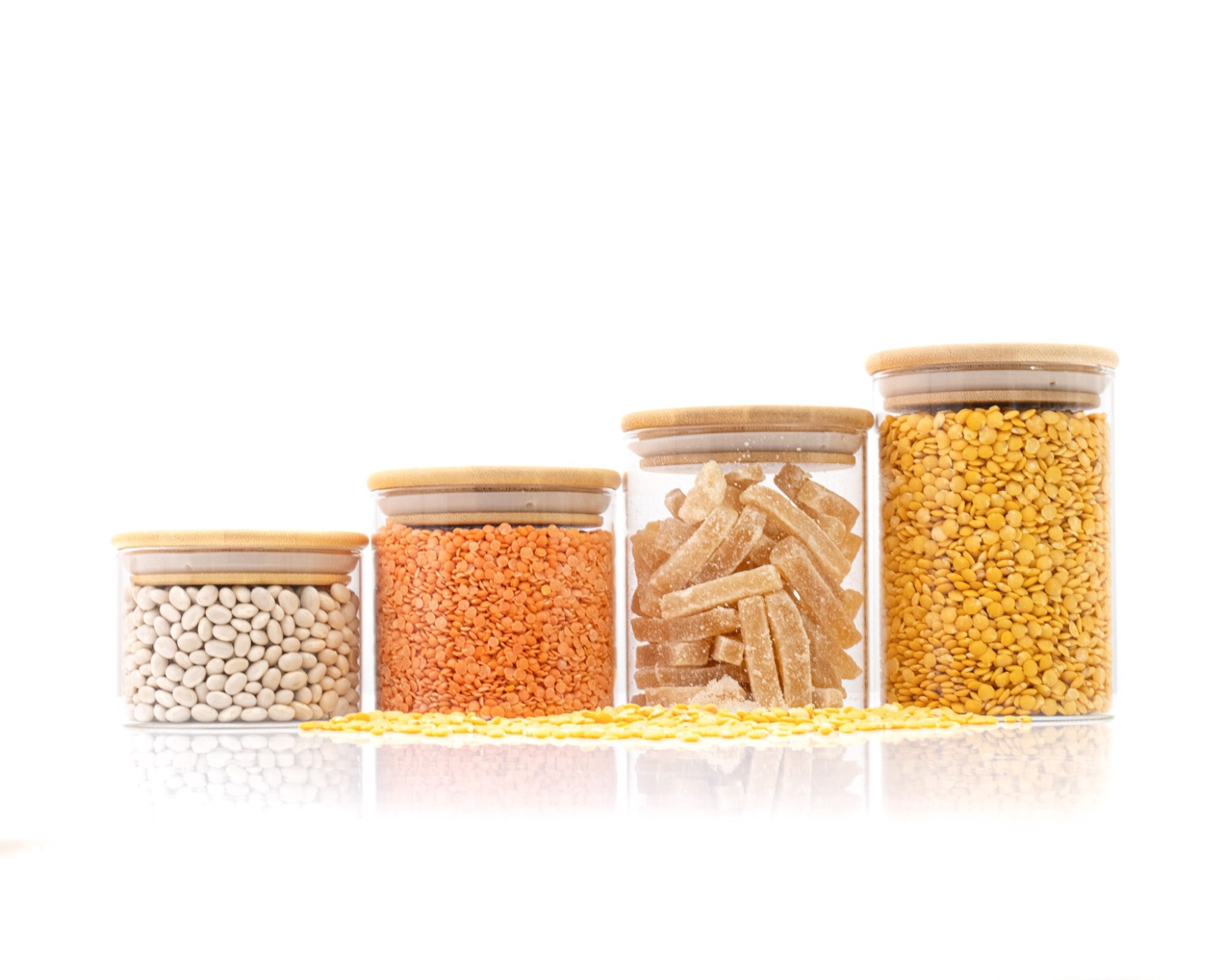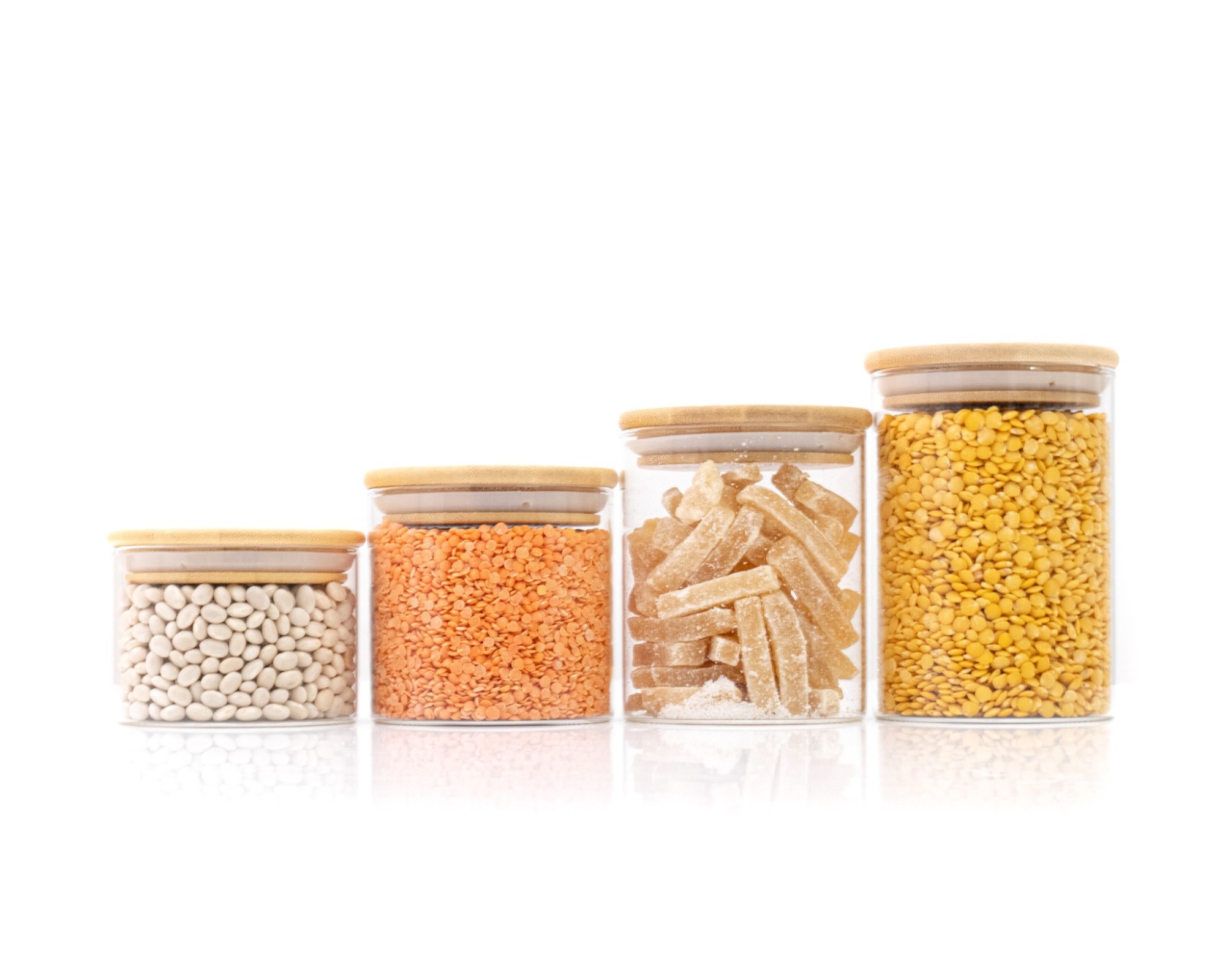 4 Sturdy glass containers with 4 different heights (6cm, 8cm, 10cm and 12cm, each 1cm higher with a lid)
