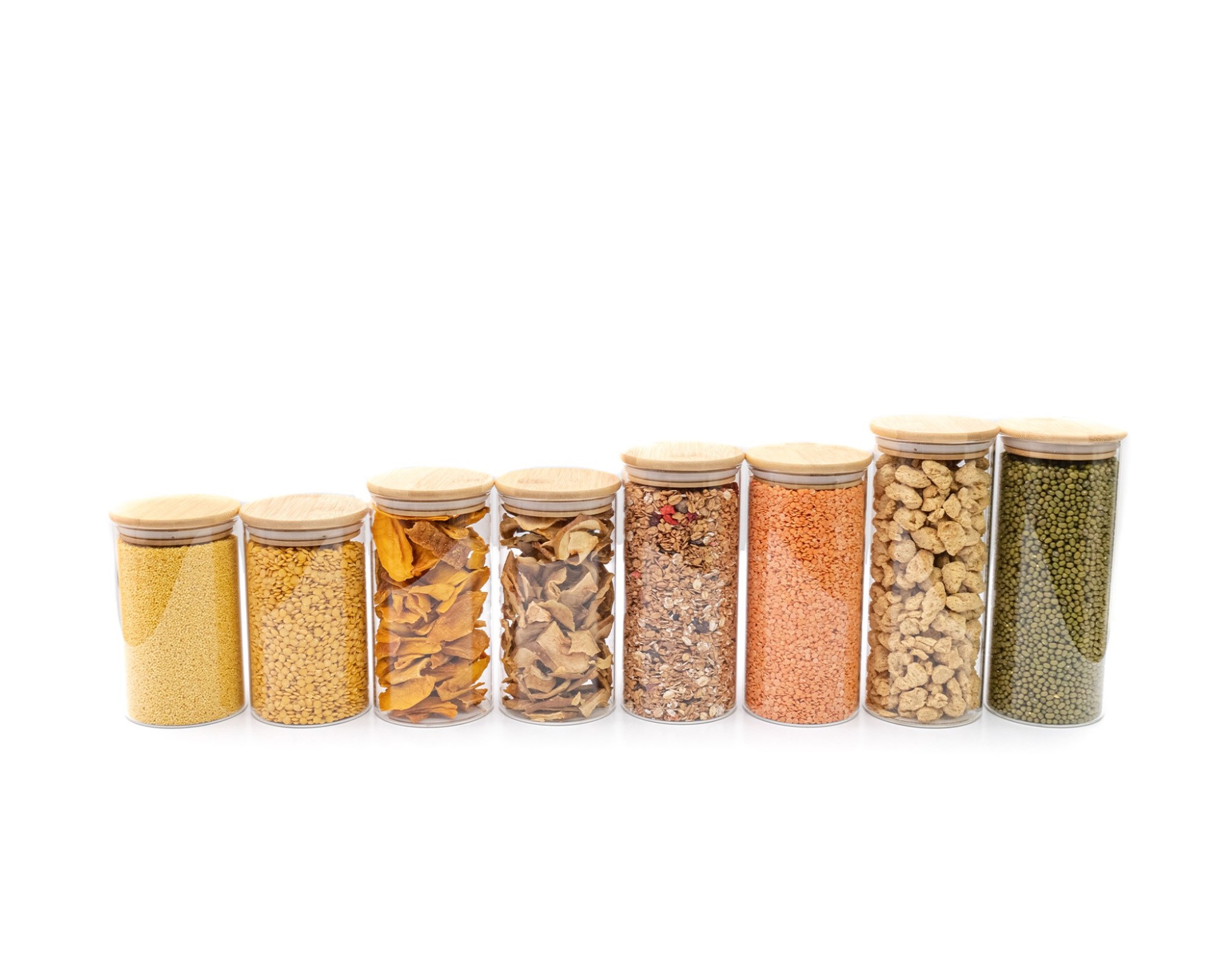 8 Sturdy glass containers with 4 different heights (14cm, 16cm, 18cm and 20cm, each with lid 1cm higher)