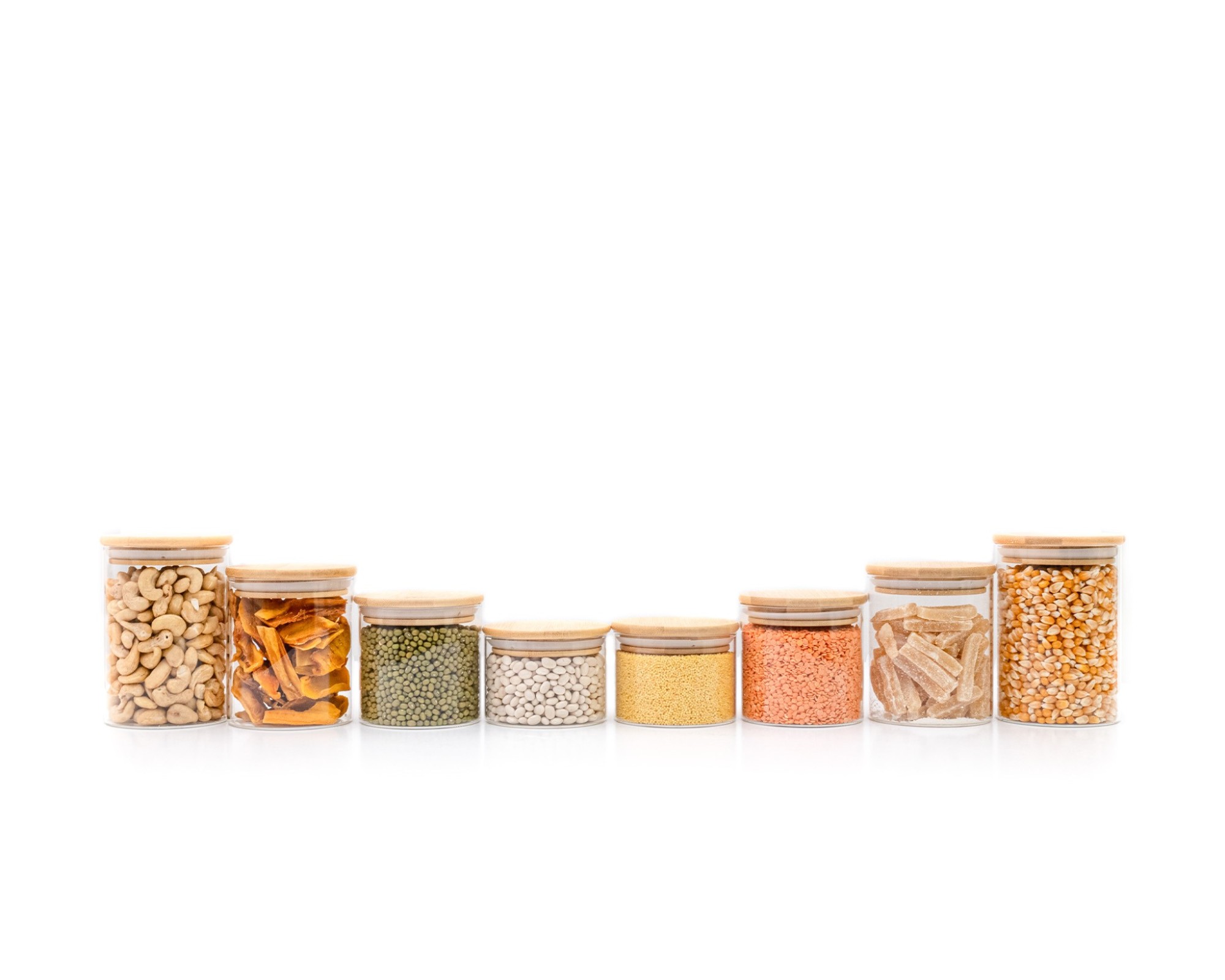 Stylish glass storage jars with round bamboo lids and 8cm diameter