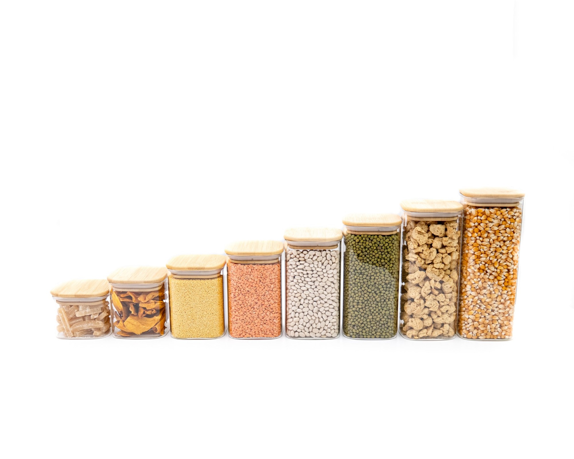 With these 8 narrow square storage jars in 8 different sizes (volume: 300ml, 400ml, 500ml, 600ml, 700ml, 800ml, 1000ml and 1200ml) you can safely store your supplies all year round. The advantage of transparent storage jars is that you always know how your food is doing. Through the