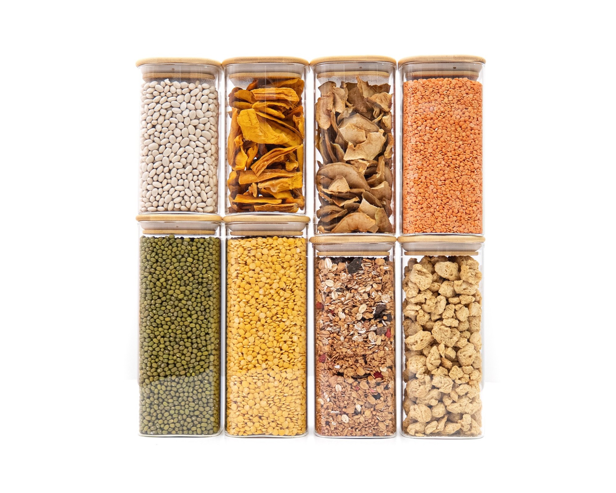 With these 8 narrow square storage jars (2 pieces each with a volume of 800ml, 900ml, 1050ml and 1200ml), you can safely store your supplies all year round. The advantage of transparent storage jars is that you always know how your food is doing