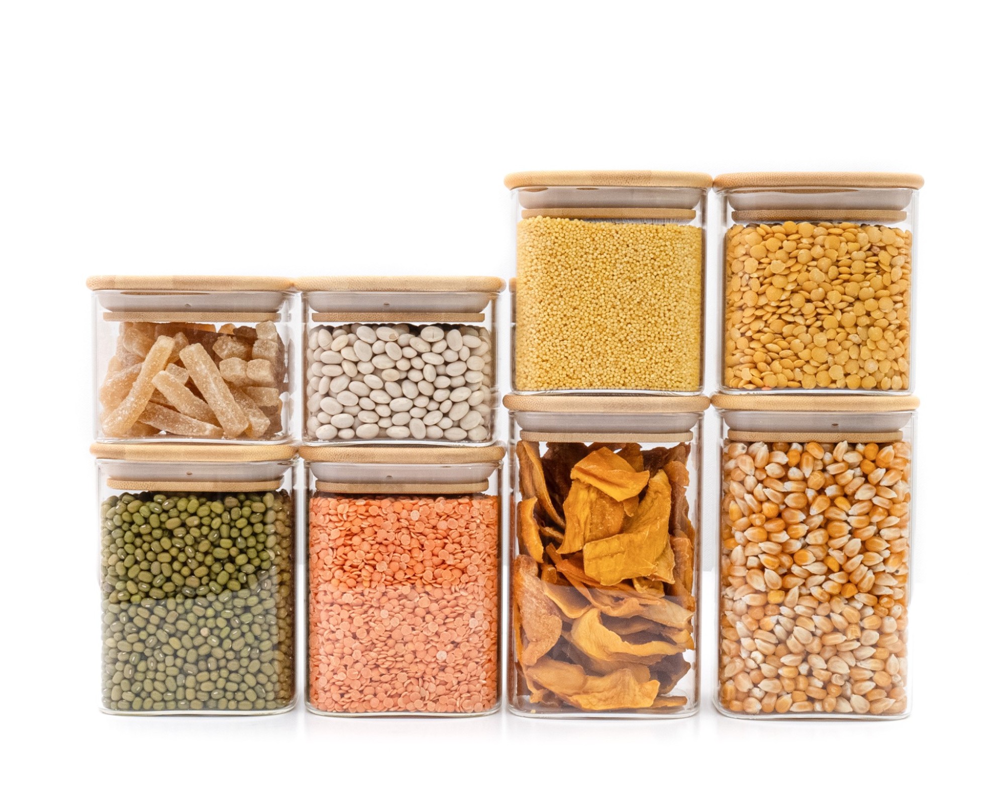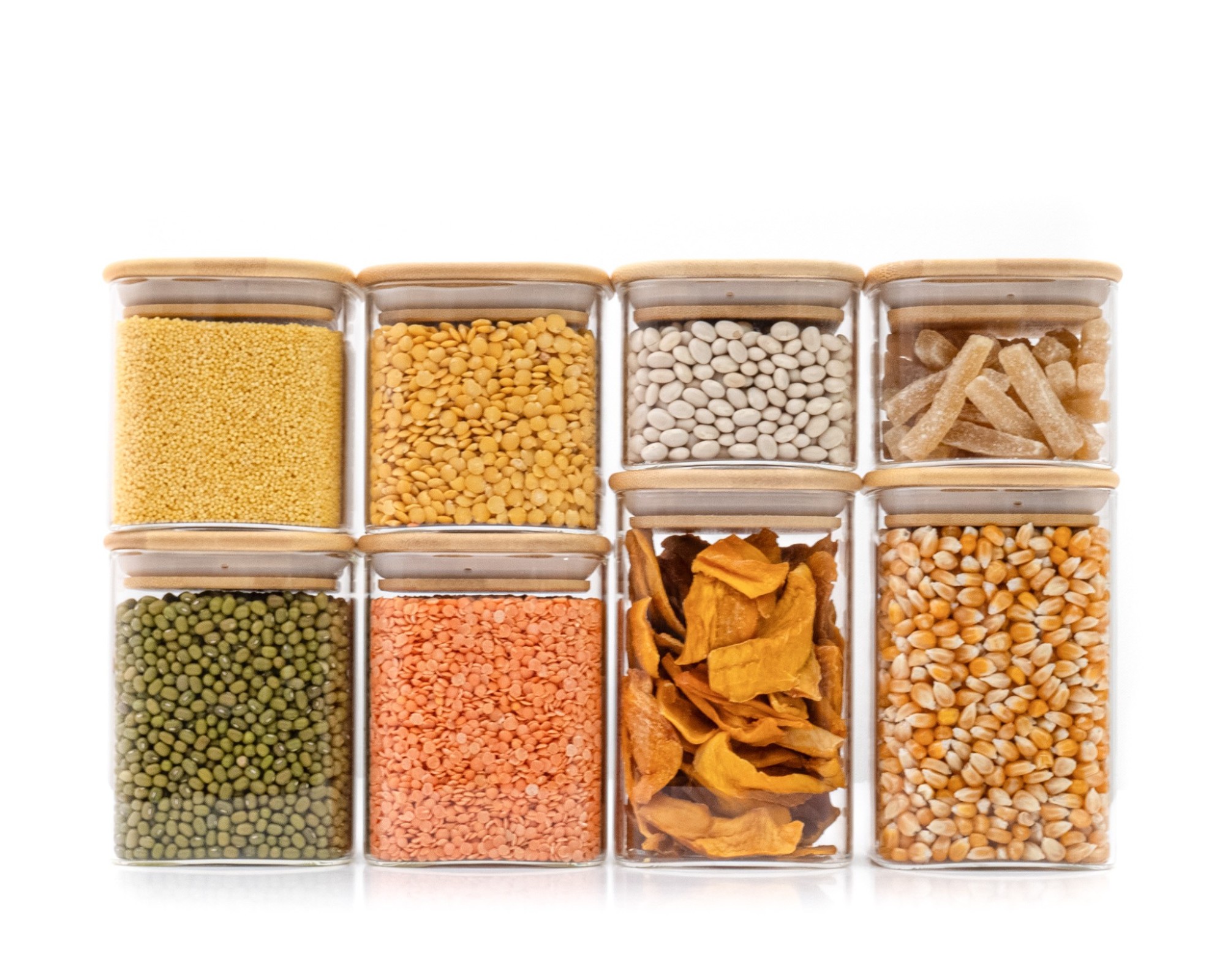 With these 8 narrow square storage jars, 2 each with a volume of 300ml, 400ml, 500ml and 600ml, you can safely store your supplies all year round. The advantage of transparent storage jars is that you always know how your food is doing. Through the
