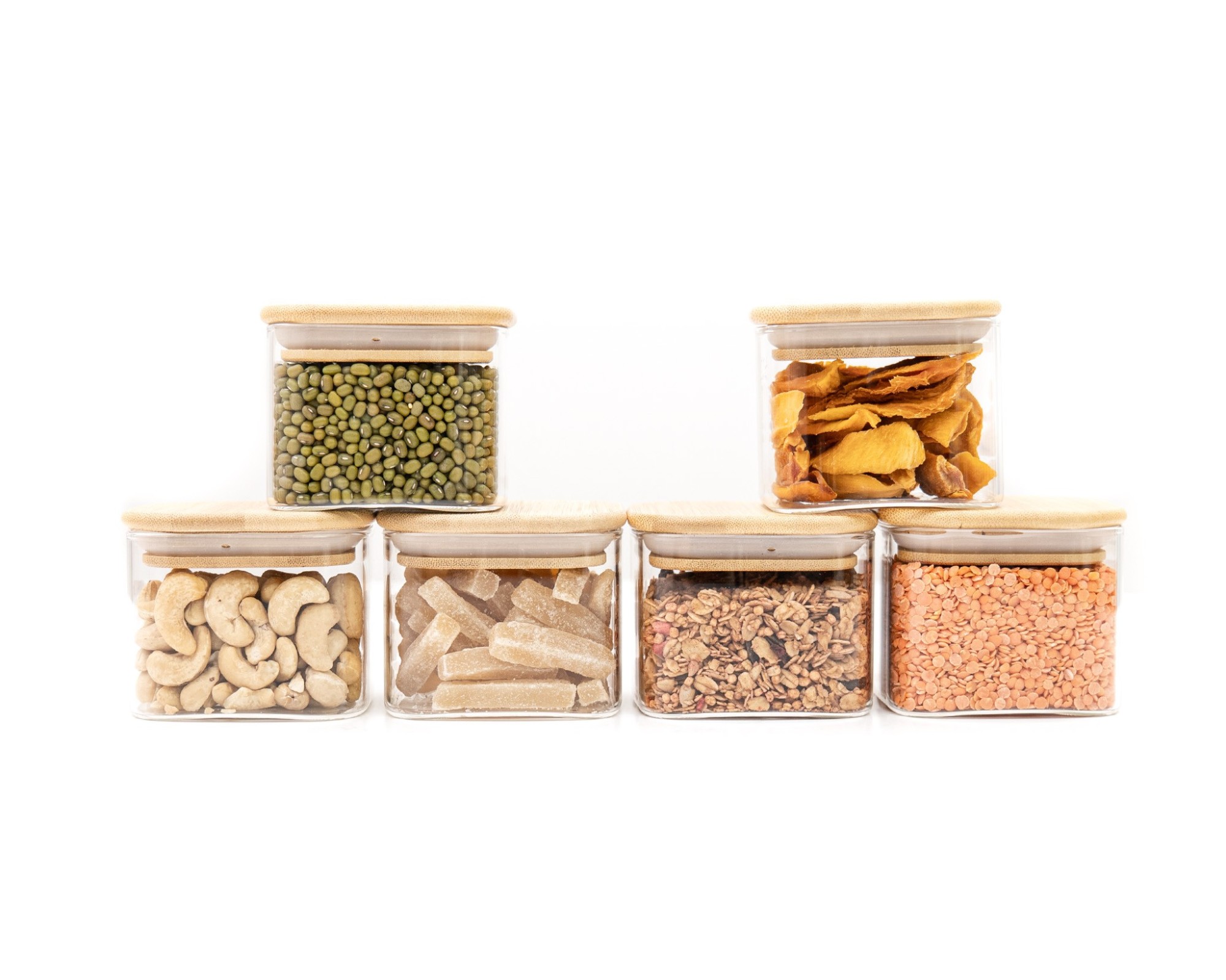 Eleganti contenitori in vetro con coperchi quadrati in bambù
