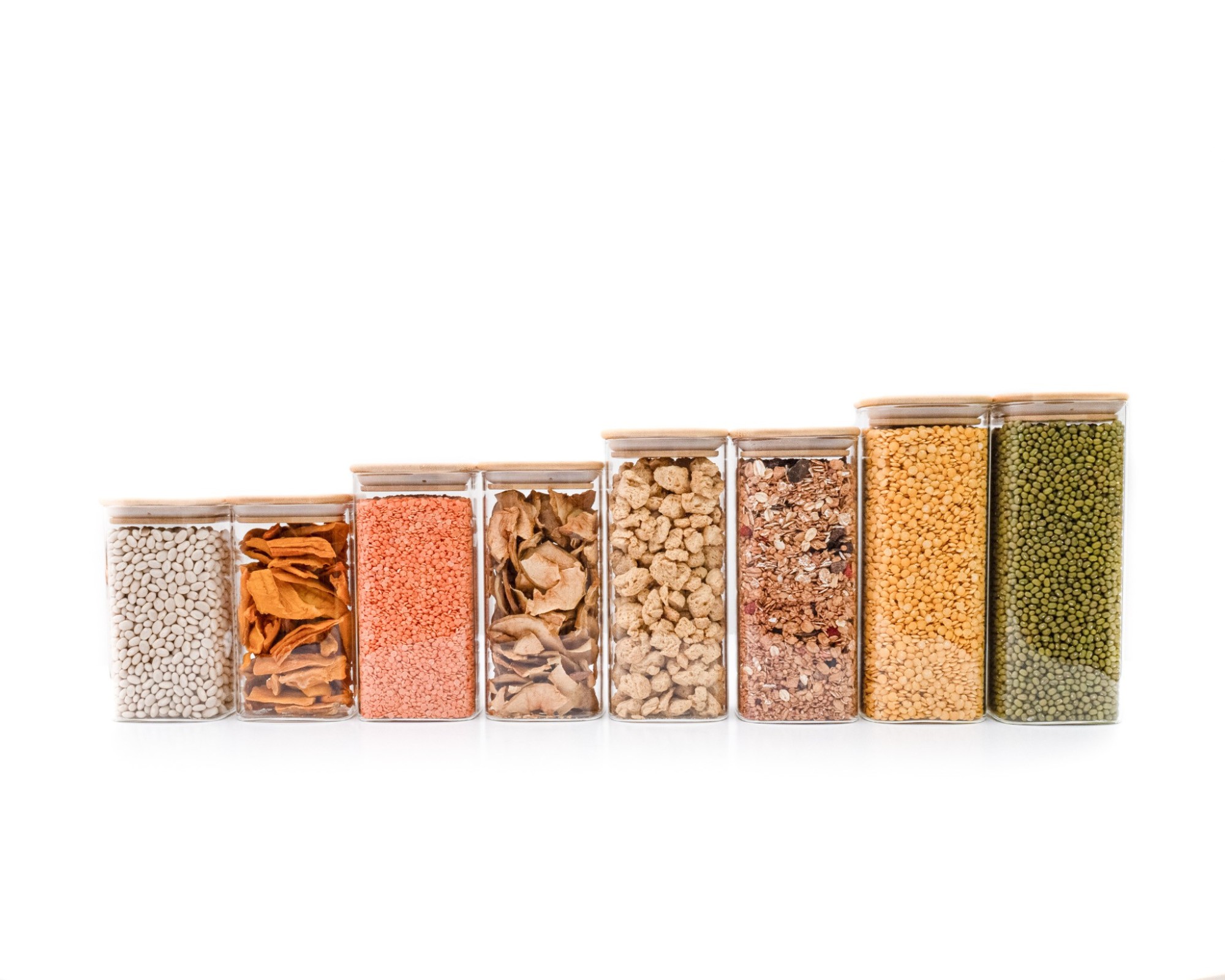 8 Contenitori robusti in vetro con 4 diverse altezze (14 cm, 16 cm, 18 cm e 20 cm, ciascuno con coperchio 1 cm più alto)