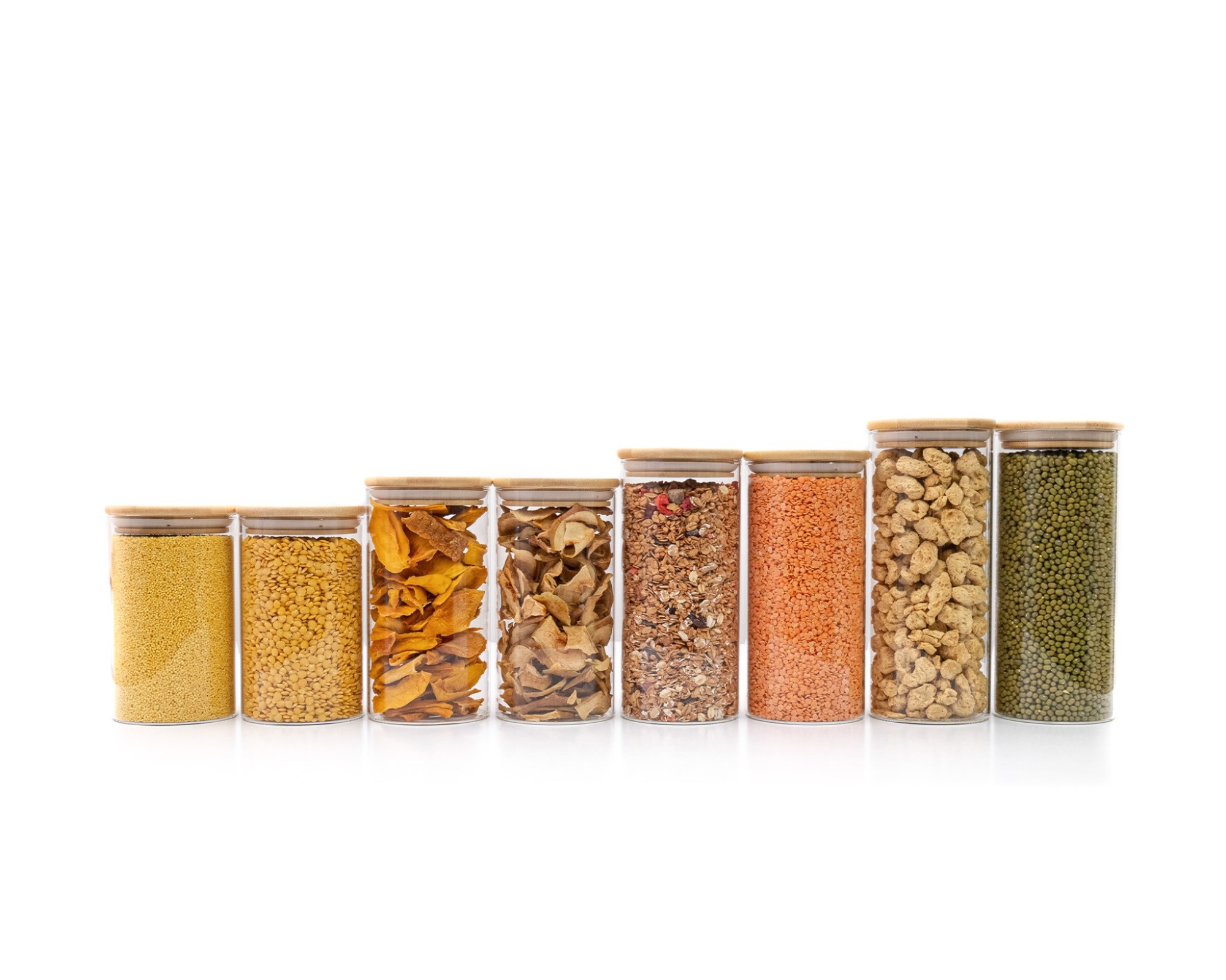 8 Contenitori robusti in vetro con 4 diverse altezze (14 cm, 16 cm, 18 cm e 20 cm, ciascuno con coperchio 1 cm più alto)