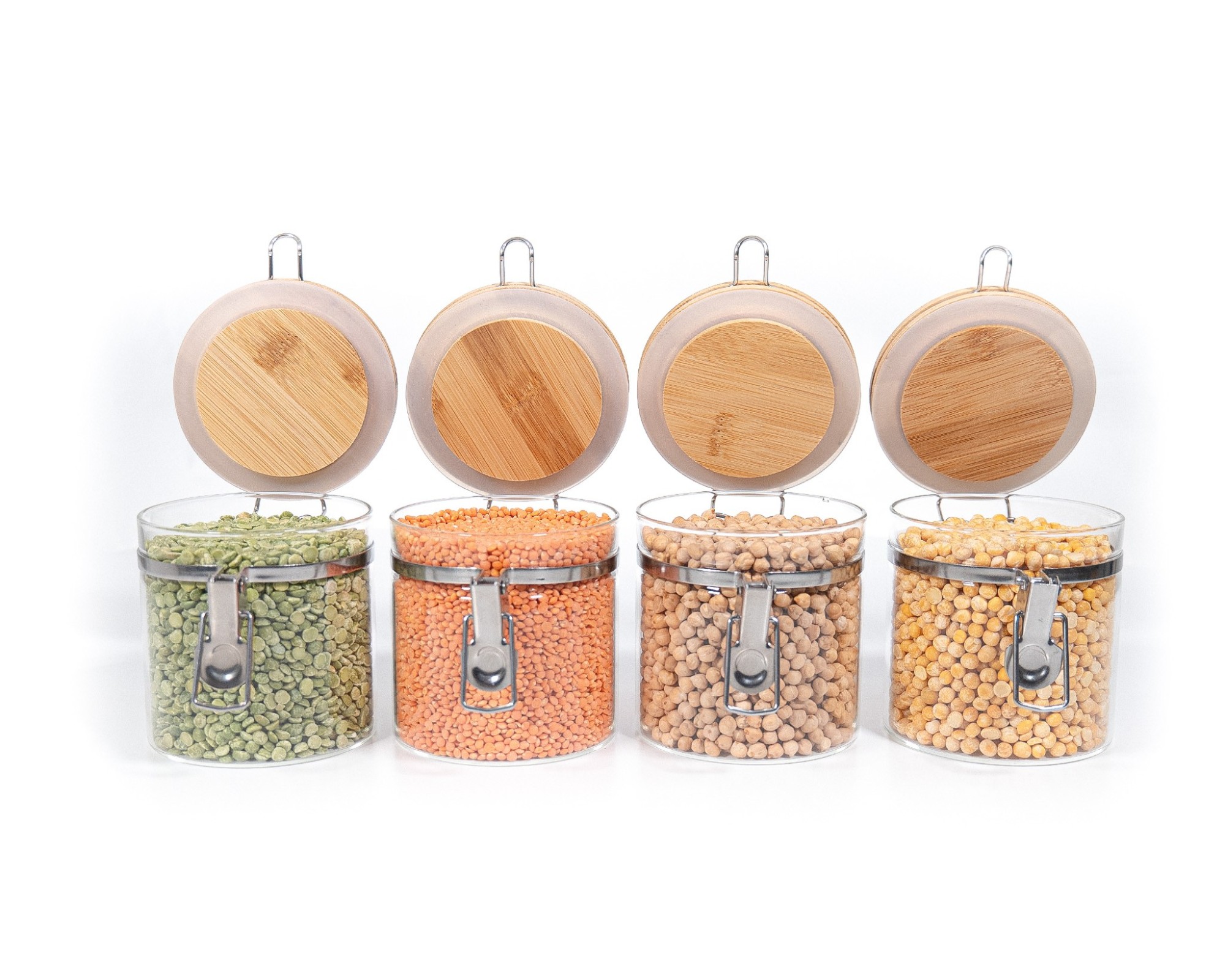 • 4 X coperchio di bambù con anello di tenuta e chiusura di clip