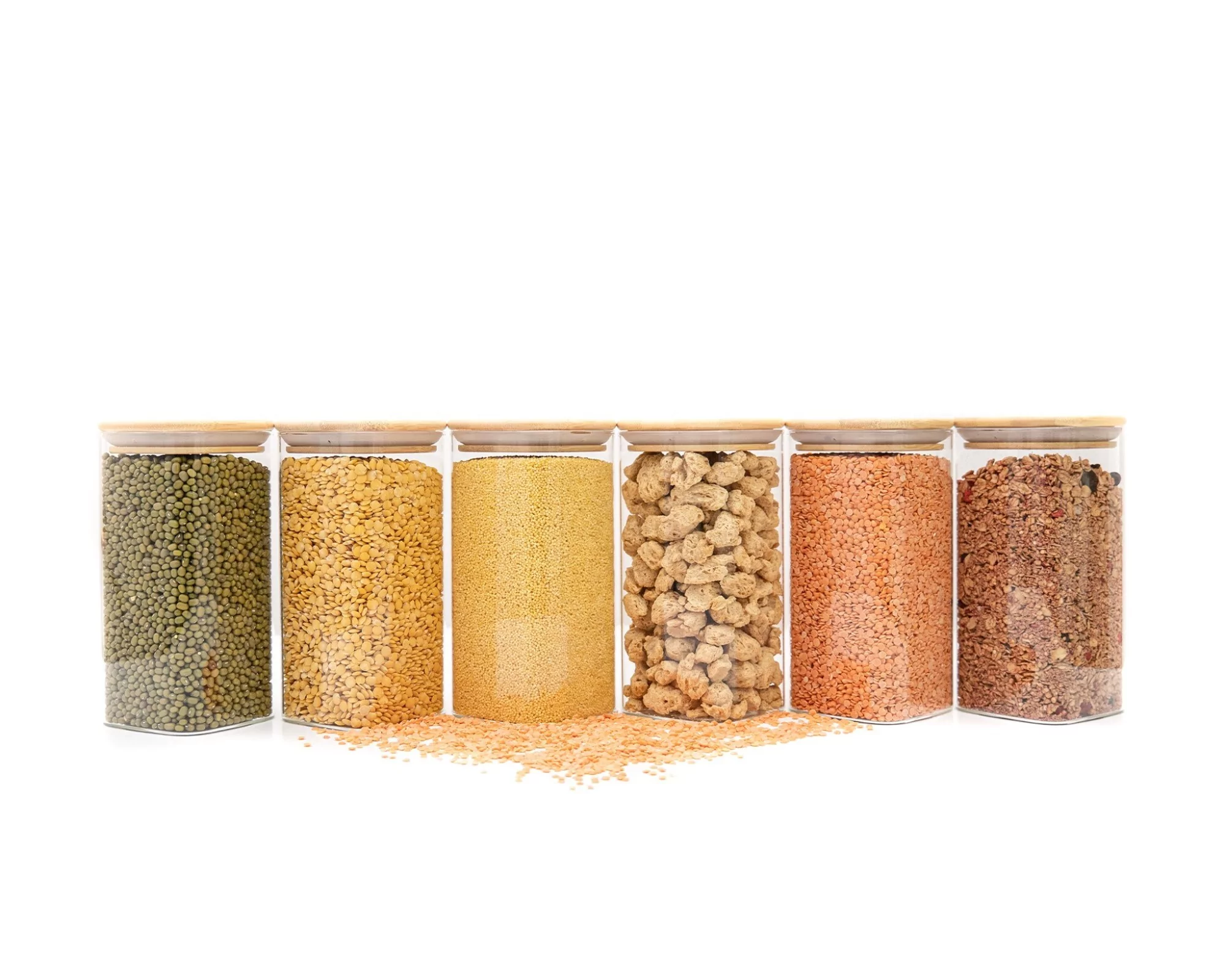 Stylische Vorratsdosen aus Glas mit quadratischem Bambusdeckel