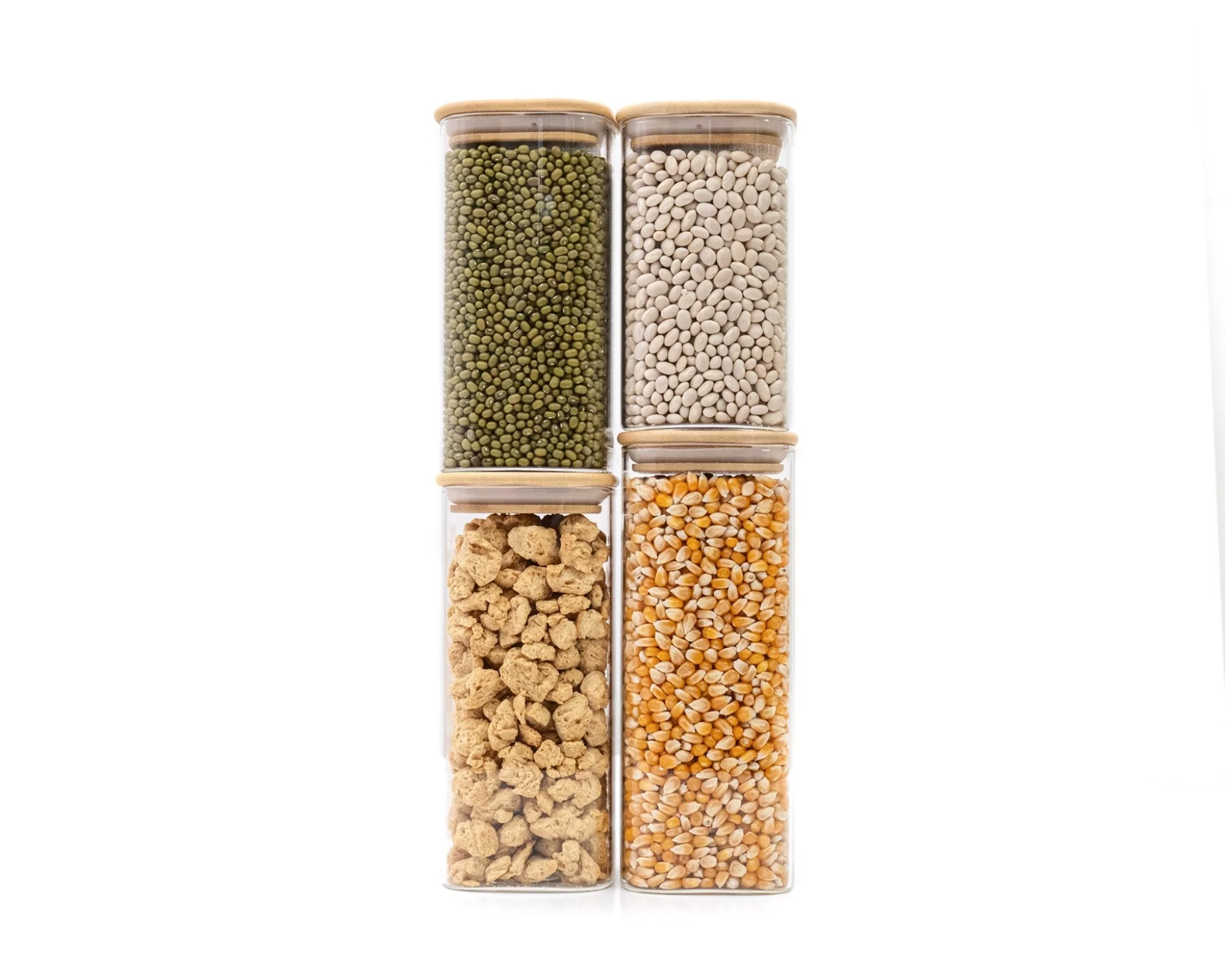 Mit diesen 4 schmalen quadratischen Vorratsgläsern (Volumen 700ml, 800ml, 1000ml und 1200ml) kannst du deine Vorräte über das ganze Jahr sicher verstauen. Der Vorteil von durchsichtigen Aufbewahrungsgläsern ist, das du immer weisst, wie es deinen Lebensmitteln geht. Durch den
