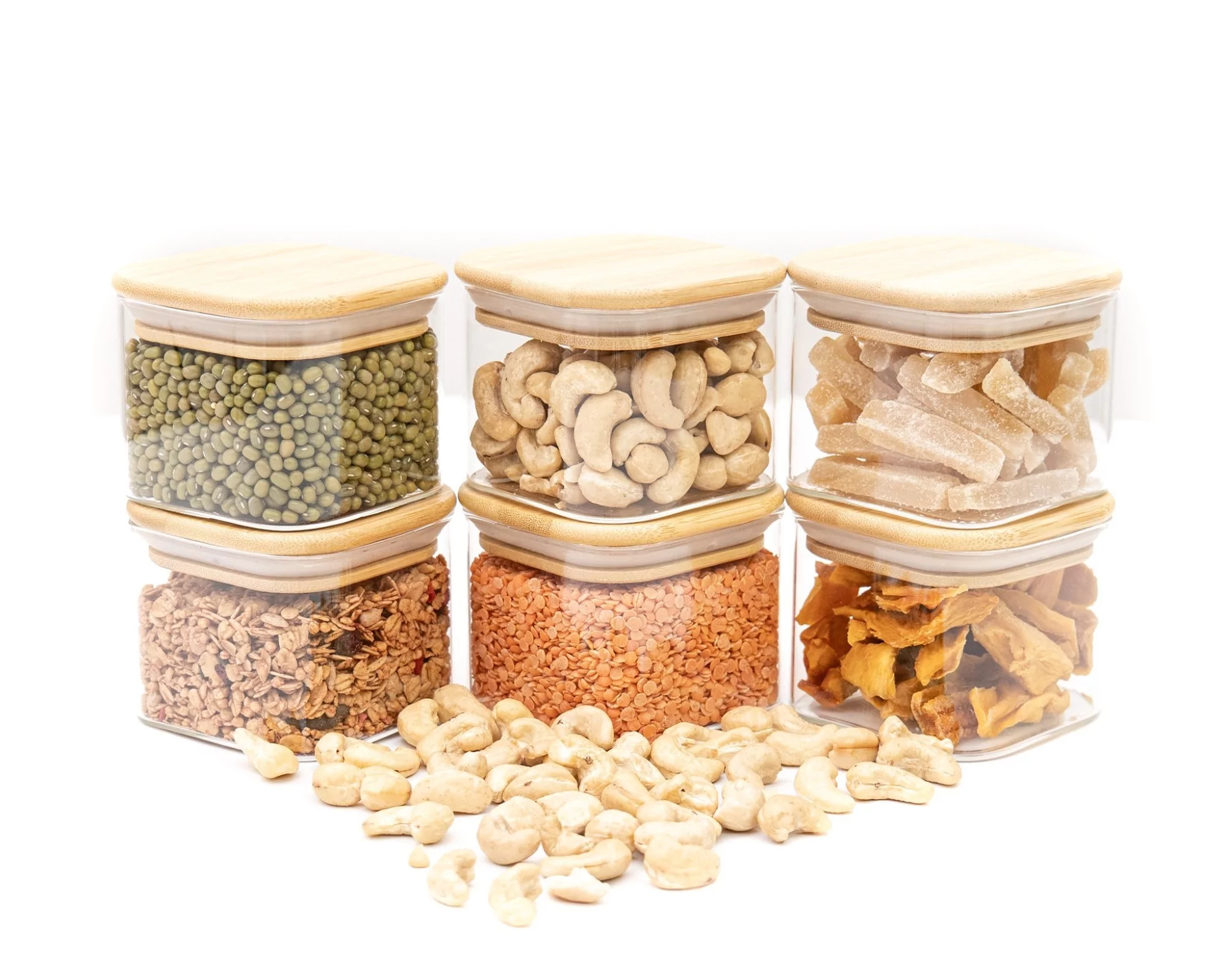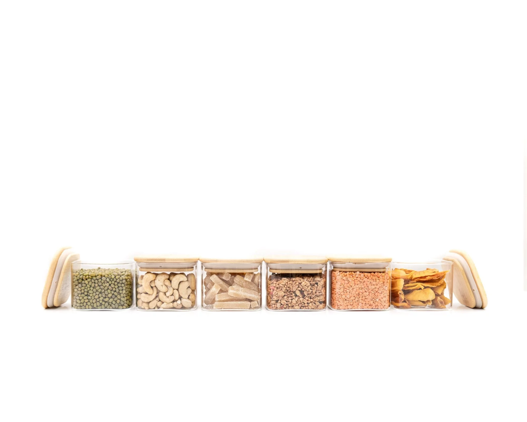 Stylische Vorratsdosen aus Glas mit quadratischem Bambusdeckel