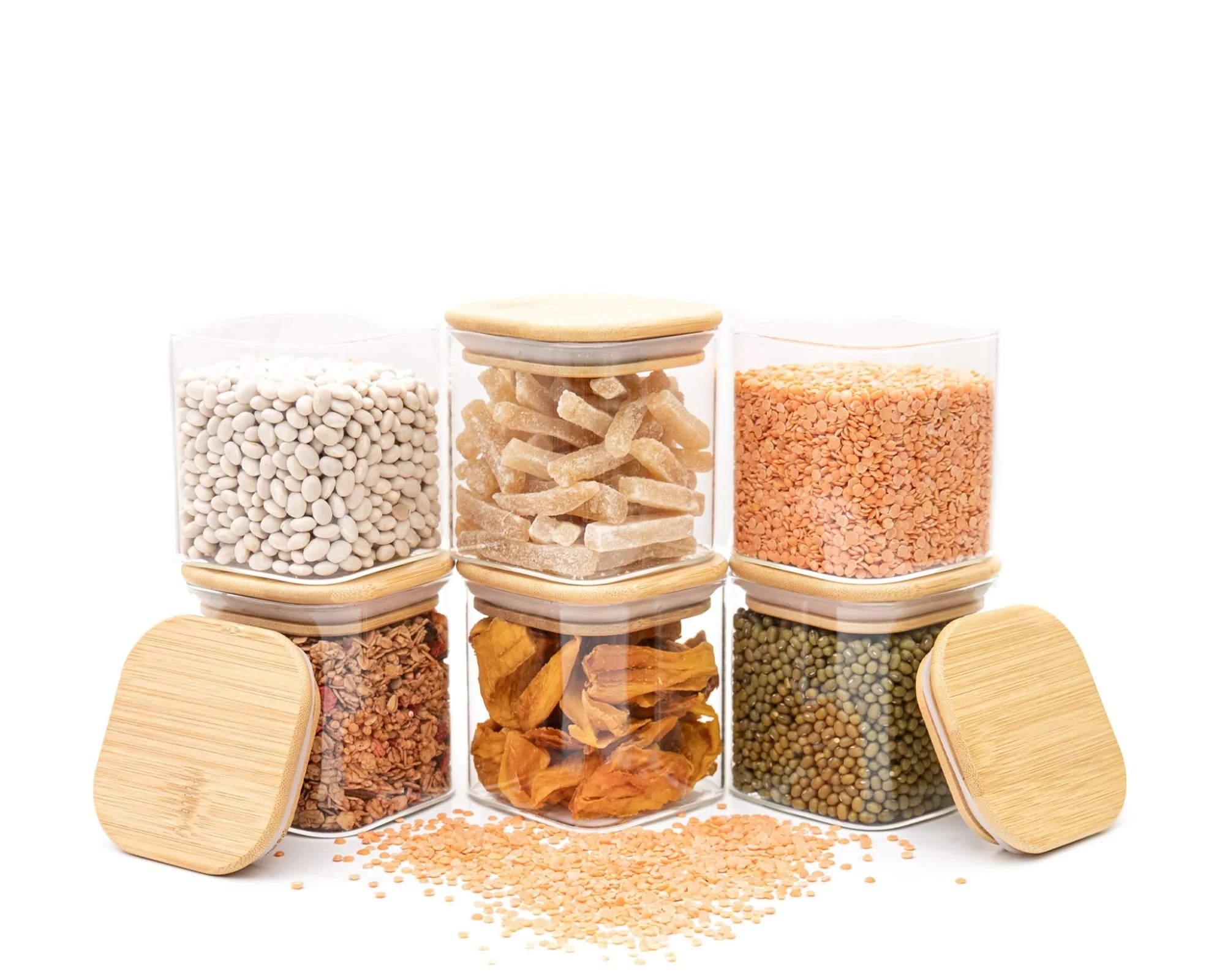 Stylische Vorratsdosen aus Glas mit quadratischem Bambusdeckel